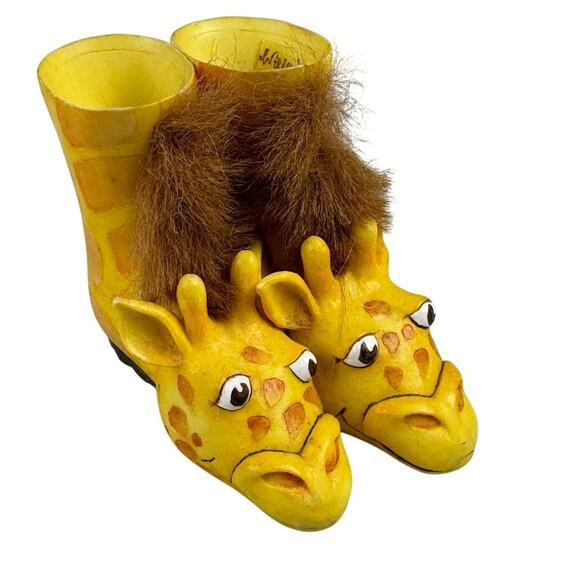 Add a dose of whimsical charm to your collection with this rare Willow Hall Original Shoo Shoo figurine titled "Chomp Chomp." This adorable design features a playful pair of giraffe boots complete with hand-painted spots, expressive faces, and fuzzy brown manes. Stamped on the sole as Shoo Shoo Official Design No. 24.