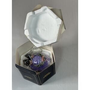 The Willow Hall Vintage Purple Passion Hat and stand, circa 1881, is a small, handmade miniature accessory designed from lace with a British style. This unique collectible piece is from the Age of Elegance collection and comes boxed, making it a perfect addition to any decor. The hat, standing at 5 inches tall and weighing 6 ounces, is a one-of-a-kind novelty item that captures the essence of vintage charm and timeless elegance.