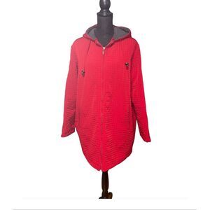 Red quilted jacket. Hood with drawstring. Full zip closure. Side pockets. Shell/filling: 100% polyester. Size: medium. Preowned in good condition.