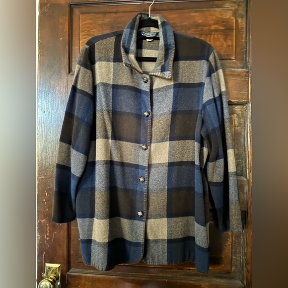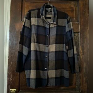 Elegant checkered coat with button closure. Features a blend of blue, black, and tan hues. Two pockets on the front. Lighter weight due to it being a wool blend.