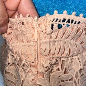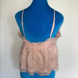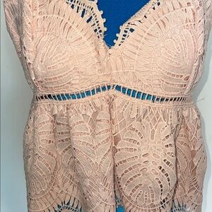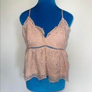This sleeveless camisole in a soft pink hue features a peplum design with intricate lace detailing. The deep V-neckline and spaghetti straps add a touch of elegance, while the embellished waistline enhances its romantic appeal. Perfect for dressy occasions, this top combines sophistication with a modern twist.