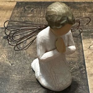 Figure of angel in cream dress and wire wings, kneeling with hands in prayer position