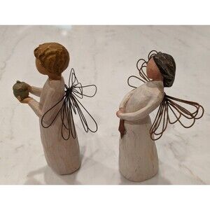 This product is a lot of 2 Willow Tree figurines called "Angel of Light" and "Angel of the Kitchen" by artist Sue Lordi. These angels are part of the Willow Tree collection and are beige in color, with a tea pot and star pattern. The angel with star is 5" and the tea pot figure is 5.5" in size and are perfect for any room, making them suitable for all occasions. These figurines are a licensed reproduction and feature angels as their subject, adding a touch of art and angelic theme to any decor.