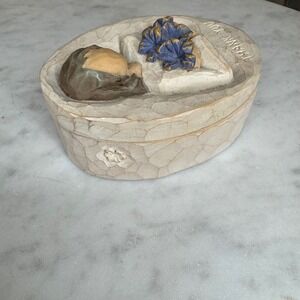 A token of gratitude, this Willow Tree keepsake box whispers appreciation with its delicate design. An angel figure, cradling a bouquet of blue flowers, adorns the lid, while the words "Thank You" are subtly inscribed below. Open the box to reveal a hidden message: "Appreciating your kindness!" This charming piece, crafted by Demdaco in 2005, is more than just a container; it's a heartfelt expression. Perfect for gifting to a special someone, displaying on a desk as a daily reminder of gratitude, or using as a unique jewelry box.