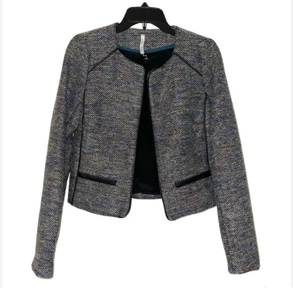 Nice slightly cropped collarless boucle blazer/jacket, with faux leather piping details. Pretty multicolored soft material, slightly thicker jacket so it’s pretty warm. Great with jeans or dressed up with a dress or pencil skirt for work. Good used condition, see pics for details. Width 20”, length 20.5”