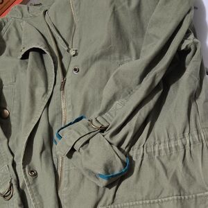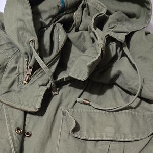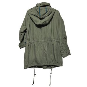Willow and Clay Olive Army Green Military Style Cargo Utility Jacket with Hood. Lots of pockets and has a drawstring at the waist and at the bottom hem. Sleeves can be cuffed and secured with built in loops. Hood can be rolled up and zips into the collar. Made of brushed canvas, 100% cotton. Excellent gently worn condition. Ladies size Medium.