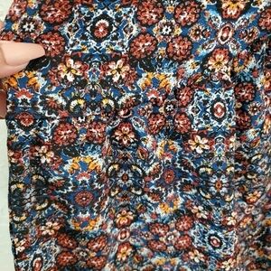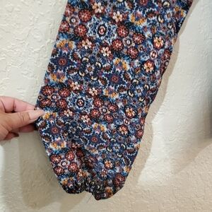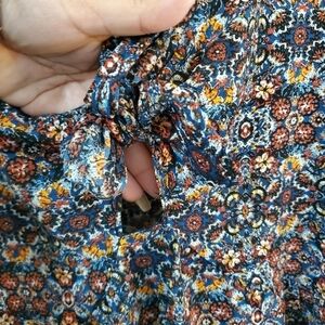 Willow and Root Long Sleeve Blouse Small. Peep hole on chest area and ties. Blue, maroon and white mini flowers. V-neck. 24 inches for length.