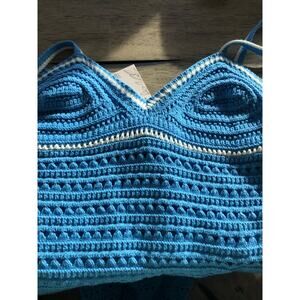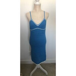 This crochet dress is perfect for a polished summer look. It is a medium knit crochet that comes in a gorgeous blue color. It is accented with white trim details. The crochet knit gives this dress a coastal look. The neckline is a v-neck that is accented by spaghetti straps. It is lined. New with tags.