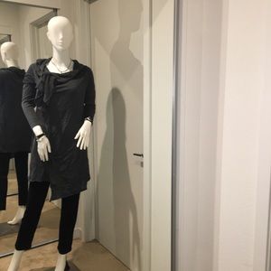 Gray cardi with asymmetrical snap closure. Collar is convertible. Gently worn. No snags, holes, stains. Poly/acrylic/nylon/wool. Dry clean only.