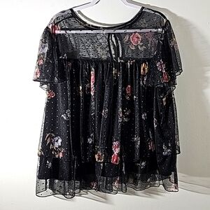 Willow women's top, 3X. Black sheer overlay tier. Floral print. Goth, f…