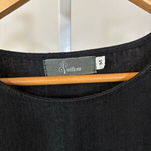 Relaxed peplum black blouse by Willow. Features front pockets and a relaxed fit. Ideal for versatile styling.