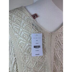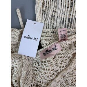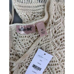 Willow+Root brand women's size XS cream crocheted lace up crop top. Brand new with tags, retails for $48. There is a very small spot on the neckline, hard to see unless looking for it. Please review all pics before purchase. Cream colored top has a lace up front with a v-neckline. Wide bell sleeves. Oversized fit, I would say this can fit up to a large.