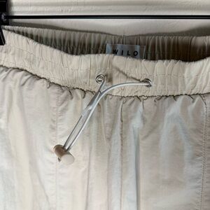 Cream colored parachute pant. Nylon outer with a mesh liner. Cute and lightweight with a cinch drawstring.