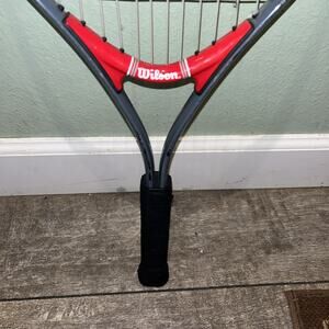 The Wilson Federer 25 tennis racquet is a 25-inch long, 7 7/8 grip size, featuring a sleek gray and red design. With the reputable brand Wilson behind it, this racquet is sure to meet the needs of tennis players looking for precision and power in their game. Perfect for beginners and intermediate players, this racquet offers a comfortable grip and a durable construction for endless hours on the court.