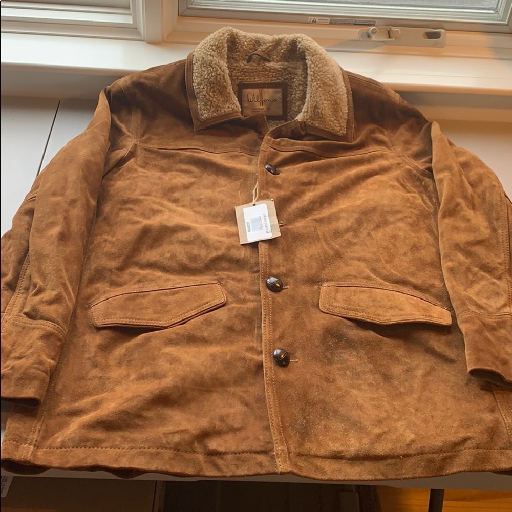 Suede four button to pocket partial Sherpa lined a few small stains see photos also bottom button has fallen off needs to be sewn back on