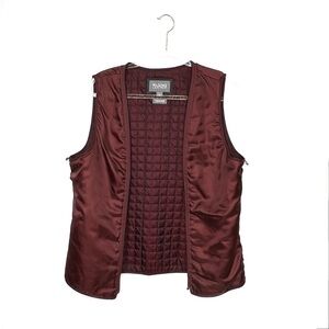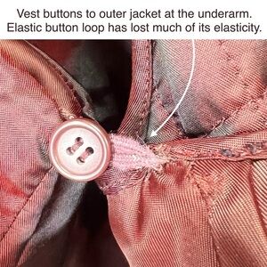Condition: Leather shell is in excellent pre-owned condition with no flaws to note. Leather remaims soft and supple | The zipper pull that allows the vest liner to connect to the outer jacket is missing so it cannot be zipped. It can still be worn, or purchaser may choose to have the zipper repaired. Also, the vest connects with a button at the underarm and while still functional, the elasticity of the button loops is failing. An easy fix for a seamstress (no leather involved) | Included are photos of the interior lining which is in excellent condition. Any variations (darker areas) you see on the lining fabric is due to its holographic nature