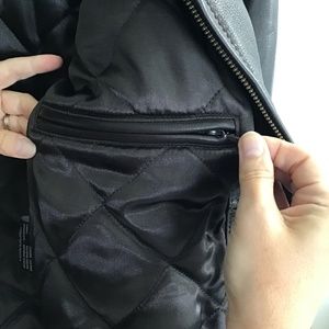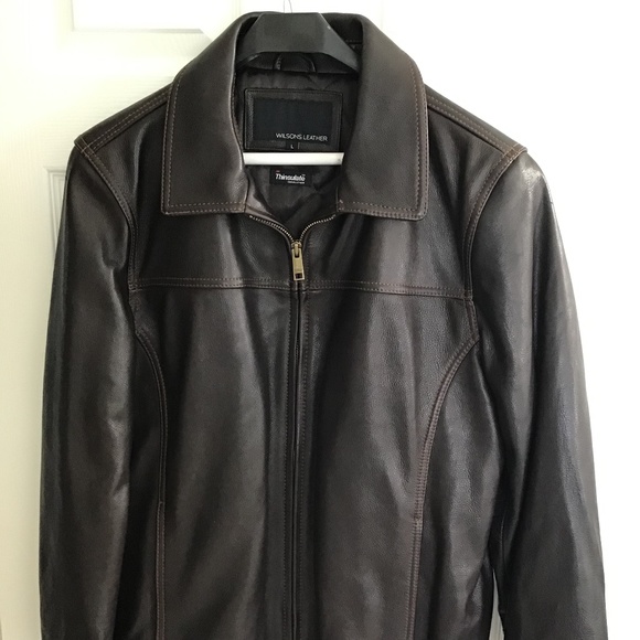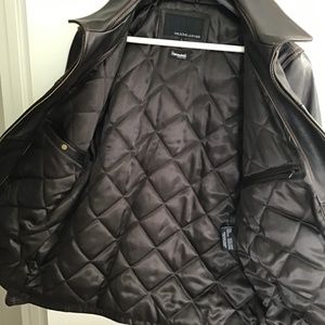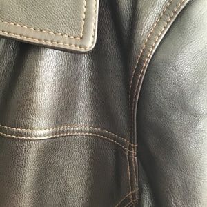 Dark Brown leather jacket with lighter brown stitching, never been worn, kept in garment bag, still has leather smell. Inside pockets for extra storage.
