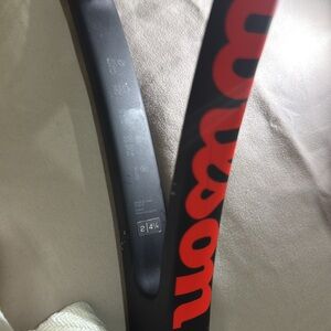 Used one Wilson Pro Staff tennis racket with red and black frame. Features a yellow string pattern. The Wilson Pro Staff v13 Team 280g racquet is a high-quality tennis racquet designed for players with a grip size of 41/4".