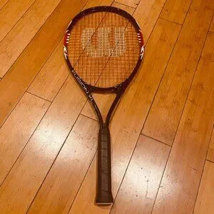 This slightly used Wilson Professional Tennis Racket is red, black and white. It is good for amateur all the way up to professional tennis players. The comfortable and easy to grip handle makes this tennis racket easy to grip and swing; for practice and tennis matches. The net is tightly fitted to the racket, which will allow any tennis ball to bounce right off of it.