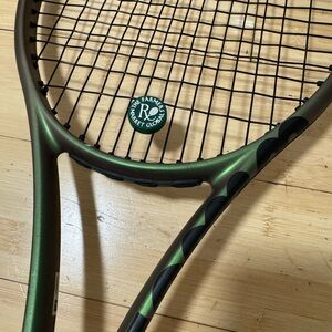Please see photos for details. I know very little and bought this racket when I attempted to learn tennis. The person at the store helped me.
