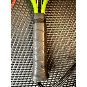 Elevate your game with the Wilson Xpress Titanium Crushing Power Racquetball Racquet. Meticulously crafted for the discerning athlete, this racquet boasts a vibrant neon yellow frame that is not only eye-catching but also facilitates high visibility during play. Constructed from durable titanium, this racquet offers a lightweight yet robust design that provides long-lasting performance. Its power strings feature a striking red pattern, ensuring a dynamic response and powerful impact with every hit. The sturdy grip is wrapped in chic dark tones, offering optimal comfort and control, further enhanced by a contoured handle for a secure hold during the most intense rallies. Ideal for competitive and recreational players alike, this racquet promises to deliver both precision and power to your racquetball arsenal.
