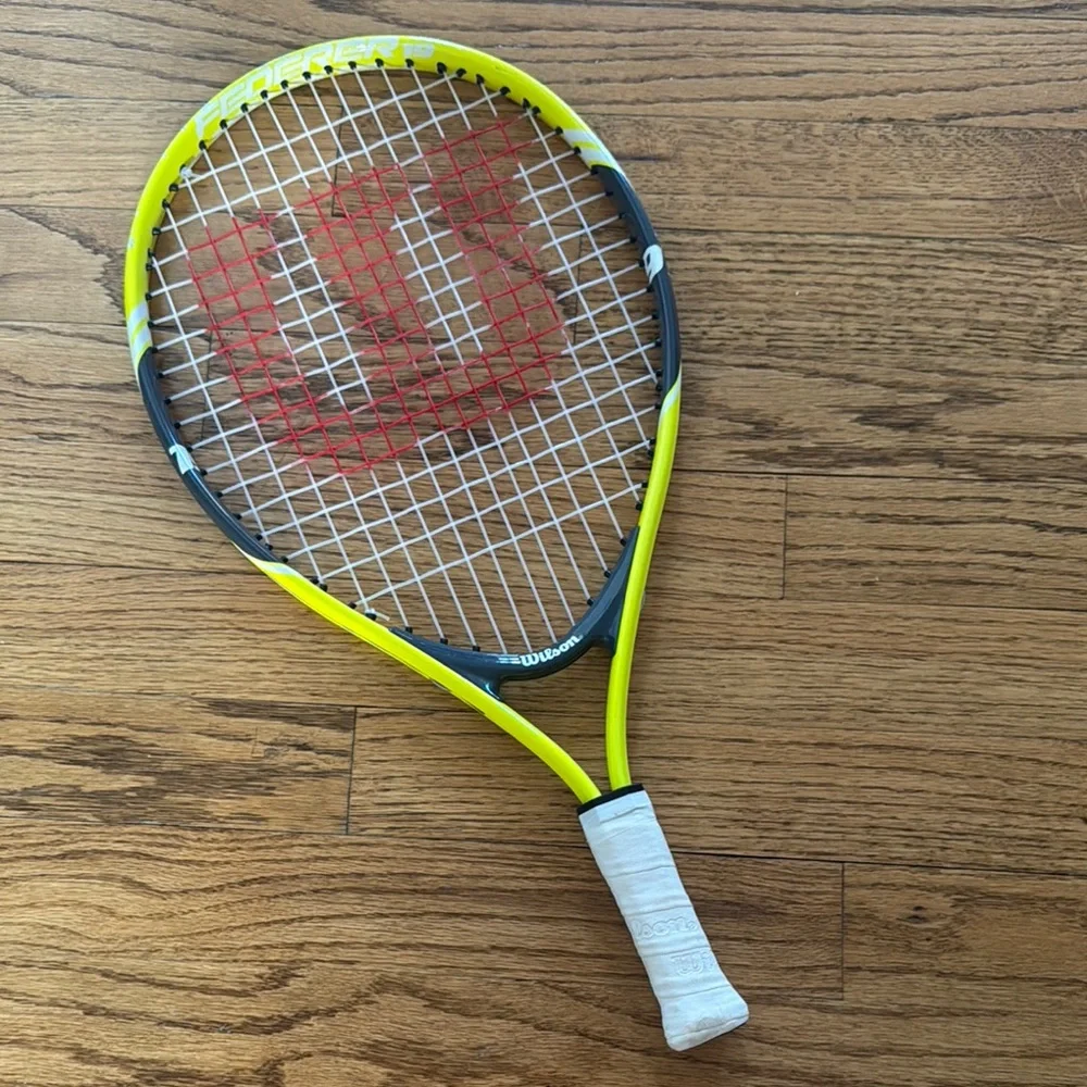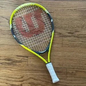 Wilson tennis racket with a vibrant yellow frame. Features a comfortable grip. Ideal for tennis enthusiasts. Size 3 1/2 which is suitable for children up to age 5
