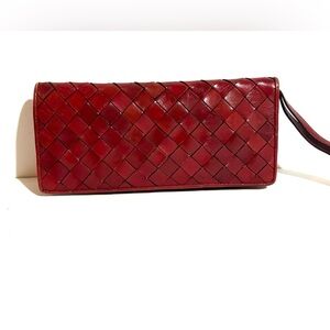 This elegant red woven leather clutch wristlet is perfect for any occasion. Its stylish design and vibrant color make it a must-have accessory. Main compartment 1 zip pocket closure at interior wall fabric lining exterior have minor marks hight 4” wide 9.5” depth 1”