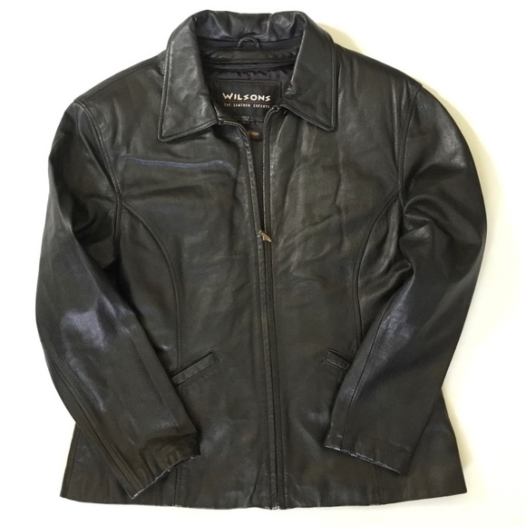 Wilsons hip length soft leather jacket has zip out Thinsulate lining and 2 front pockets. Great condition. No fading or tears.