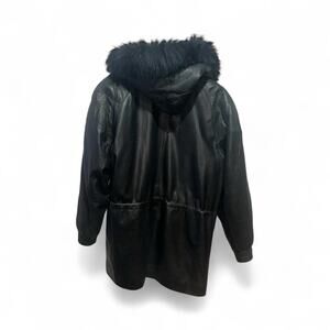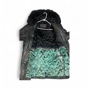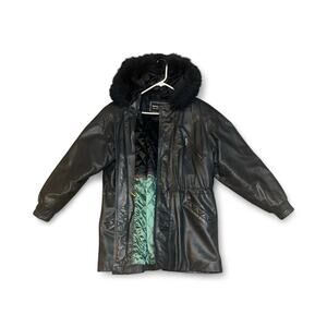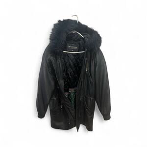 Wilson's Black Leather Fur Hood Women's Zip up Jacket Sz M Padded Shoulders