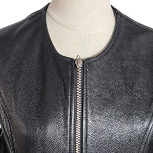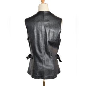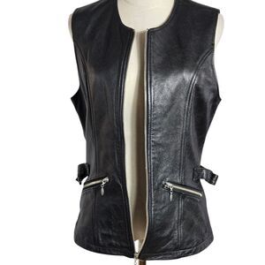 Sleek black leather vest. Front zipper closure. Side zip pockets. Stylish and versatile.