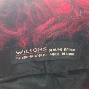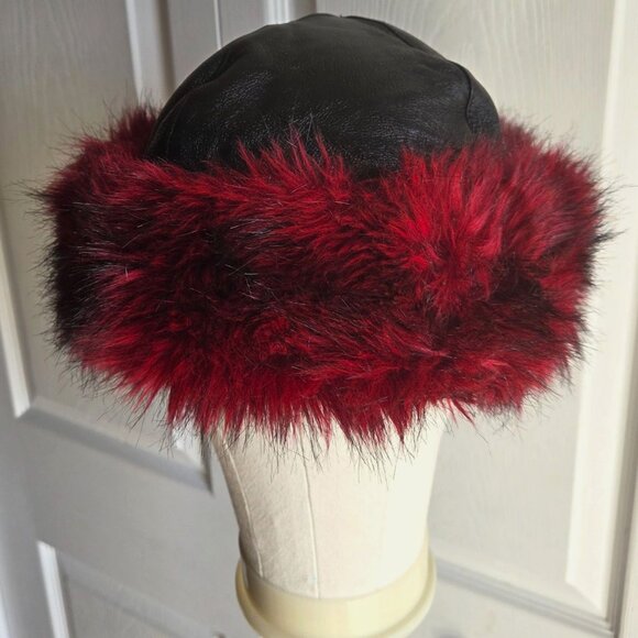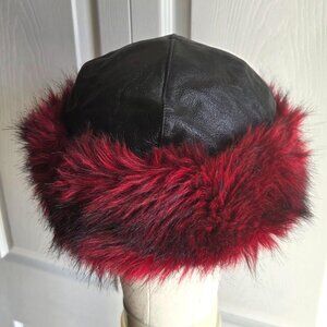 Elegant leather hat with vibrant red fur trim. Perfect for stylish outings. Adds a touch of luxury.