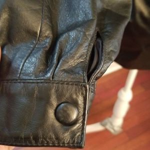 Beautiful black leather jacket featuring shawl collar, side pockets, v neck, shoulder pads, drawstring toggle waist, snap closure, and fully lined. Gently used with minimal wear. Measures approximately 40" bust, 34" waist, 22" sleeves, 28" long, 17" shoulders. Don't cut my price in half & send offer please