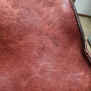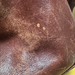 CONDITION: leather is worn and has fading, some ink marks and a few spots, last photo shows an small area where fabric has rubbed off (when zipper is shut it does not show), expect wear throughout. Still functions perfectly and has a great broken in look.