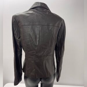 Brown genuine leather coat. Blue lining, dry clean only. Button up front. No hood. Small wear on the right chest (pictured), only flaw.