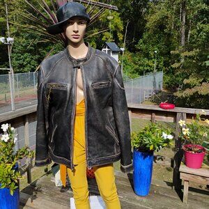A true vintage Wilson’s Leather heavyweight moto jacket in 100% genuine leather, naturally distressed to perfection — that broken-in, lived-in look you can’t fake. Thick leather, solid hardware, and that classic Harley-Davidson style stand collar with snap closure.