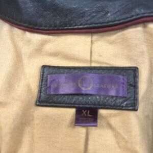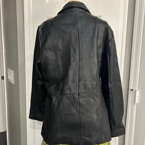 Classic Wilson’s Leather genuine leather blazer jacket in black. Soft, pebbled real leather with a structured, mid-length fit and two-button front. Fully lined (cotton body / nylon sleeves). Tag size XL, but measurements fit more like a Women’s Medium–Large.