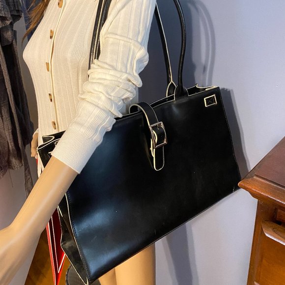 Wilson's Leather Large Black with Off White Tote/Laptop Bag W/Buckle Clasp