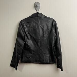 Details: patchwork 1990s Vintage leather jacket collared neckline blazer long sleeve Corpcore professional biker single breasted