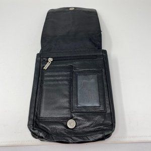 - Wilson’s Leather Pelle Studio Black leather organizer wallet crossbody bag with 2 main compartments with snap flaps, one side has an outside zip pocket, underneath is an ID slot, 5 card slots, zip pocket, other side under flap has a phone pocket , 2 pen slots, another zip pocket. Zip pocket in this main compartment.