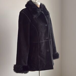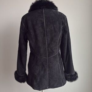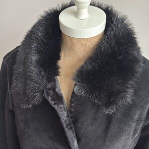 Wilsons Leather Pelle Studio black suede leather coat with faux fur trim.