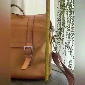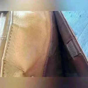 See pictures for measurements.  This bag is preowned and leather is nicely worn and soft.  Inside is very clean. On one of the strap ends the leather has come apart but is still attached with black nylon material, could easily be re-stitched.  The strap has small cracking as pictured, otherwise the strap is in great condition.  There are a few small wear areas on corners and on handle, no holes.  This bag has been carefully cleaned and leather treated.