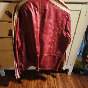 Bold red leather with striking white stripes, distressed look. Classic cafe racer style. Bought new 20 years ago and still in incredible shape.