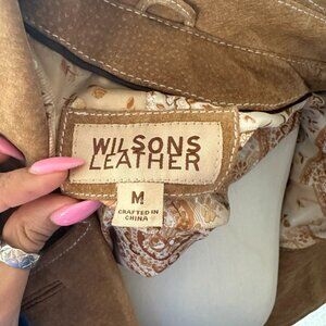 Stylish double-breasted leather jacket. Features a belted waist. Perfect for a chic look.