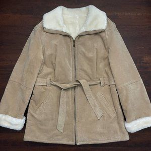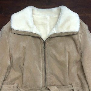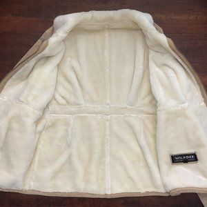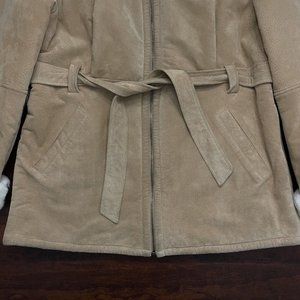 Wilsons Leather Tan Suede Jacket Coat Faux Fur Lined Belted Tie Zip XL Collar.