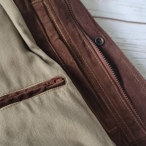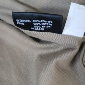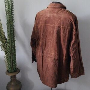 Lush chocolate brown leather coat with zip and button front. This coat features 9 pockets, including 3 on the inside. The button tab shoulders add a little style. Inner lining pictured.