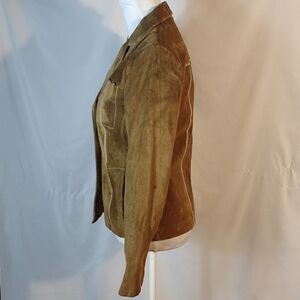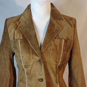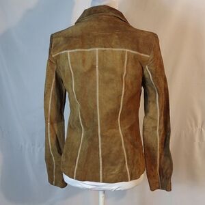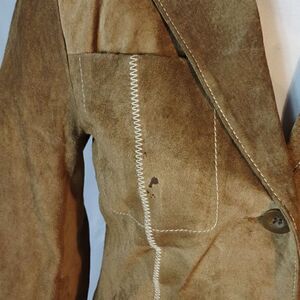 This brown suede button down Wilsons Leather women's jacket is a size Small with a pit to pit measuring 19". It has four front pockets. Fully lined. Pre-owned and in great condition there is a spot on right chest pocket (see photo #5). All offers are welcome.