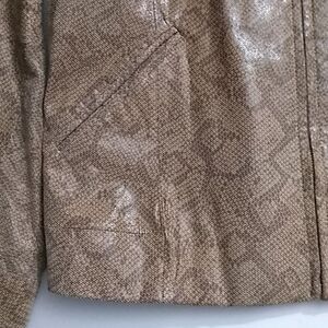 Wilsons snakeskin-print leather tan/brown zip jacket. Size - Medium. Jacket has 2 diagonal front pockets and a full front gold colored zipper. Outershell: 100% leather, lining: 100% nylon. Each sleeve cuff has a snap closure. Very nice jacket in great condition!