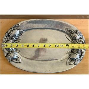 Elevate your entertaining game with this exquisite Old World Pewter serving set, a timeless ensemble designed to add a touch of elegance to any occasion. The set includes a beautifully crafted oval serving tray adorned with a raised fruit and leaf design around the rim, accompanied by a matching bowl featuring a delicate beaded edge and a charming serving knife with a fruit-themed handle. The intricate details and lustrous finish create a captivating visual appeal, transforming your table into a showcase of refined taste. Perfect for displaying appetizers, desserts, or small delicacies, this serving set brings a touch of sophistication to cocktail parties, holiday gatherings, or elegant dinner parties.