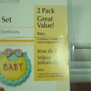 This listing is for a Wilton Candy Mold Set with 10 baby designs--it is a 2 pack set with 5 designs on each sheet--total of 10 designs or cavities--see pictures for designs included. Great for baby showers. New in original packaging.