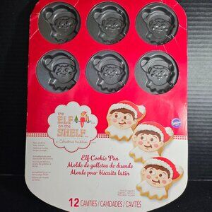 Wilton brand Elf on the Shelf cookie pan. 2105-8551. Has a non stick coating for quick easy release. Delicious cookie recipe on the back of the package. 12 cavity pan to make 12 cookies at a time. A wonderful surprise for the elf on the shelf to leave the kids elf cookies. Brand new with tags. Package has a small tear that's been taped up on the bottom. Non-smoking pet free home. @ER Shelf 2